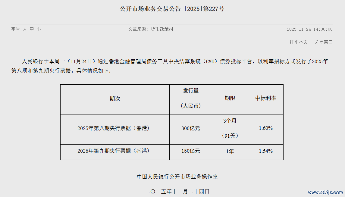 央行今日在香港发行2025年第八期和第九期央行票据央行今日在香港发行2025年第八期和第九期央行票据